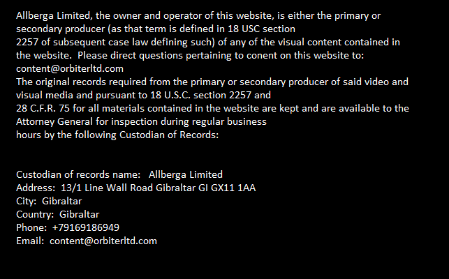 | The actors, models, actresses and other persons that appear in any visual depiction of actual sexually explicit conduct appearing or otherwise contained in this website were over the age of eighteen years at the time of the creation of such. With respect to all visual media as defined above displayed on this website, whether of actual sexually explicit conduct, simulated sexual content or otherwise, all persons in said visual depictions were at least 18 years of age when said visual media, as defined above, were created. |